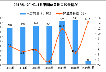中商情报网讯:据中商产业研究院数据库显示,2013年-2015年中国蔬菜出口量呈小幅度增长,2017年-2018年中国蔬菜出口量维持增长趋势;2019年1月中国蔬菜出口量为75万吨,同...【详情】