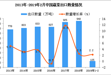 中商情报网讯:据中商产业研究院数据库显示,2013年-2015年中国蔬菜出口量呈小幅度增长,2017年-2018年中国蔬菜出口量维持增长趋势;2019年1-2月中国蔬菜出口量为125万吨...【详情】