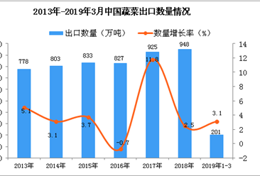 中商情报网讯:据中商产业研究院数据库显示,2013年-2015年中国蔬菜出口量呈小幅度增长,2017年-2018年中国蔬菜出口量维持增长趋势;2019年1-3月中国蔬菜出口量为201万吨...【详情】