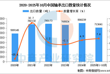 中商情报网讯:据中商产业研究院数据库显示,2024年中国轴承出口量806239吨,同比增长4.9%。最新数据显示,2025年1-10月中国轴承出口量713641吨,同比增长7.6%。 数据来...【详情】