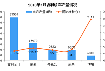 中商情报网讯:据中商产业研究院数据库显示,2018年7月吉利轿车产量为39557辆,同比下降36.62%。2018年1-7月吉利轿车产量为355397辆,同比下降4.03%。 产量第一的车型是帝...【详情】