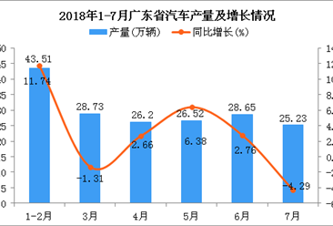 中商情报网讯:据中商产业研究院数据库显示,2018年4月-6月广东省汽车产量呈上升趋势,2018年6月广东省汽车产量为28.65万辆,同比增长2.76%。2018年7月广东省汽车产量有所...【详情】