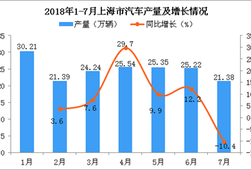中商情报网讯:据中商产业研究院数据库显示,2018年3月-7月全国汽车产量逐渐下降,2018年7月全国汽车产量为206.4万辆,同比下降0.5%。2018年1-7月全国汽车产量为1637.7万...【详情】