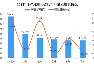 中商情报网讯:据中商产业研究院数据库显示,2018年3-7月湖北省汽车产量逐渐下降,2018年7月湖北省汽车产量为17.73万辆,同比下降6.59%。2018年1-7月湖北省汽车累计产量为...【详情】
