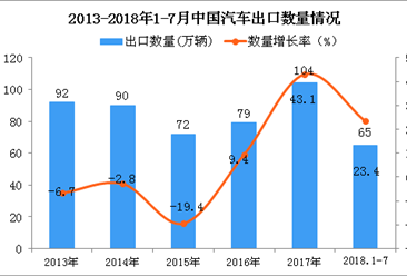 中商情报网讯:据中商产业研究院数据库显示,2015年-2017年中国汽车出口量逐渐增长,2017年中国汽车出口量为104万辆,同比增长43.1%。2018年1-7月中国汽车出口量为65万辆...【详情】