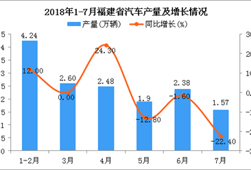 中商情报网讯:据中商产业研究院数据库显示,2018年3-5月福建省汽车产量逐渐下降,2018年5月福建省汽车产量为1.9万辆,同比下降12.8%。2018年6月福建省汽车产量有所回升,...【详情】