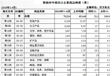 中商情报网讯:据韩国海关统计,2018年1-6月,韩国货物进出口额为5623.1亿美元,比上年同期(下同)增长9.5%。其中,出口2971.9亿美元,增长6.5%;进口2651.3亿美元,增长...【详情】