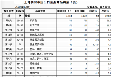 中商情报网讯:2018年1-6月土耳其对外贸易继续增长态势,据土耳其统计局统计,货物贸易进出口额为2050.6亿美元,比上年同期(下同)增长10.3%。其中,出口821.7亿美元,增...【详情】