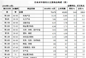 中商情报网讯:据日本海关统计,2018年1-6月日本货物进出口额为7330.3亿美元,比上年同期(下同)增长10.4%。其中,出口3694.8亿美元,增长9.8%;进口3635.6亿美元,增长1...【详情】