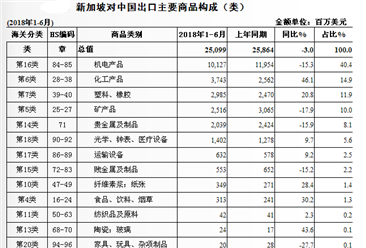 中商情报网讯:据新加坡国际企业发展局统计,2018年1-6月,新加坡货物进出口额为3787.0亿美元,比上年同期(下同)增长12.5%。其中,出口2014.6亿美元,增长12.0%;进口17...【详情】