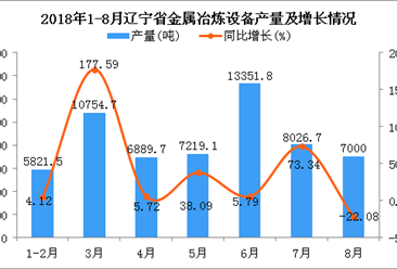 中商情报网讯:据中商产业研究院数据库显示,2018年4月辽宁省金属冶炼设备产量有明显下降,2018年4月辽宁省金属冶炼设备产量为6889.7吨,同比增长5.72%。2018年5-6月辽宁...【详情】