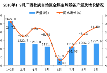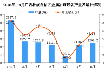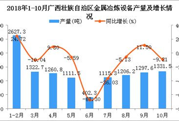 中商情报网讯:据中商产业研究院数据库显示,2018年6-10月广西壮族自治区金属冶炼设备产量连续4个月持续增长,2018年10月广西壮族自治区金属冶炼设备产量为1331.5吨,同比...【详情】