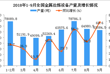 中商情报网讯:据中商产业研究院数据库显示,2018年4-7月全国金属冶炼设备产量逐渐增长,2018年7月全国金属冶炼设备产量为78786.3吨,同比增长56.9%。2018年8-9月全国金属...【详情】