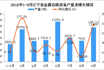 中商情报网讯:据中商产业研究院数据库显示,2018年1-3季度辽宁省金属冶炼设备产量波动幅度较大,2018年3季度辽宁省金属冶炼设备产量相比1季度增长59.48%。2018年11月辽宁...【详情】