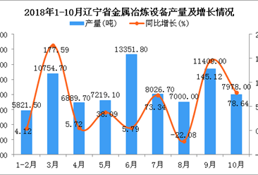 中商情报网讯:据中商产业研究院数据库显示,2018年10月辽宁省金属冶炼设备产量大幅度下降,2018年10月辽宁省金属冶炼设备产量为7978吨,同比增长78.64%。2018年1-10月辽...【详情】