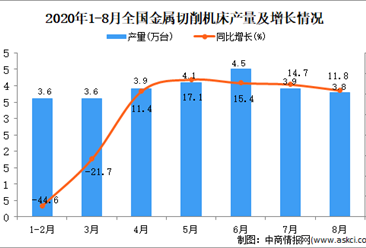 中商情报网讯:据中商产业研究院数据库显示,2020年8月全国金属切削机床产量下降,2020年8月全国金属切削机床产量为3.8万台,同比增长11.8%。2020年1-8月全国金属切削机床...【详情】
