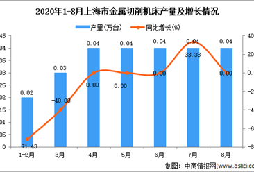 中商情报网讯:据中商产业研究院数据库显示,2020年8月上海市金属切削机床产量波动幅度较小,2020年8月上海市金属切削机床产量为0.04万台,同比持平。2020年1-8月上海市金...【详情】