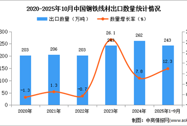 中商情报网讯:据中商产业研究院数据库显示,2024年中国钢铁线材出口量262万吨,同比增长7.8%。最新数据显示,2025年1-10月中国钢铁线材出口量243万吨,同比增长12.3%。 ...【详情】