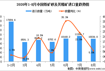 中商情报网讯:据中商产业研究院数据库显示,2020年8月中国铁矿砂及其精矿进口量下降,2020年8月中国铁矿砂及其精矿进口量为10036万吨,同比增长5.8%。 数据来源:中商...【详情】