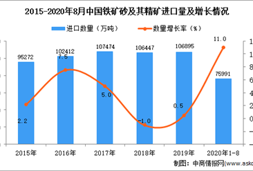 中商情报网讯:据中商产业研究院数据库显示,2020年1-8月中国铁矿砂及其精矿进口量增长,2020年1-8月中国铁矿砂及其精矿进口量为75991万吨,同比增长11%。 数据来源:中...【详情】
