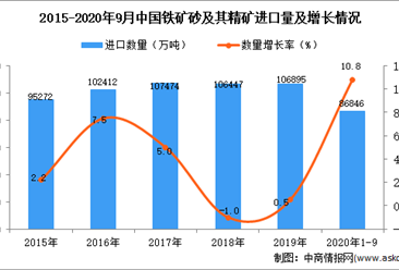 中商情报网讯:据中商产业研究院数据库显示,2020年1-9月中国铁矿砂及其精矿进口量上升,2020年1-9月中国铁矿砂及其精矿进口量为86846万吨,同比上升10.8%。 数据来源:...【详情】