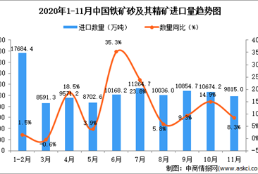 中商情报网讯:据中商产业研究院数据库显示,2020年11月中国铁矿砂及其精矿进口量下降,2020年11月中国铁矿砂及其精矿进口量为9815万吨,同比增长8.3%。 数据来源:中商...【详情】