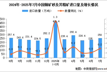 中商情报网讯:据中商产业研究院数据库显示,2025年7月中国铜矿砂及其精矿进口量256万吨,同比增长0.2%;1-7月中国铜矿砂及其精矿进口量1731.4万吨,同比增长8%。 数据...【详情】