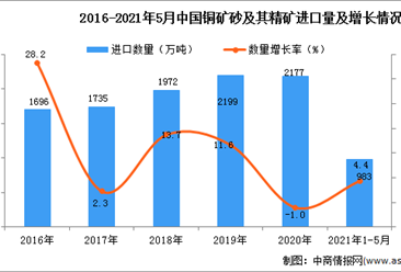 中商情报网讯:据中商产业研究院数据库显示,2021年1-5月中国铜矿砂及其精矿进口量983万吨,同比增长4.4%。 数据来源:中商产业研究院数据库 从金额方面来看,2021年1-5...【详情】