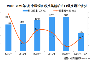 中商情报网讯:据中商产业研究院数据库显示,2021年1-6月中国铜矿砂及其精矿进口量1150万吨,同比增长6.2%。 数据来源:中商产业研究院数据库 从金额方面来看,2021年1-...【详情】