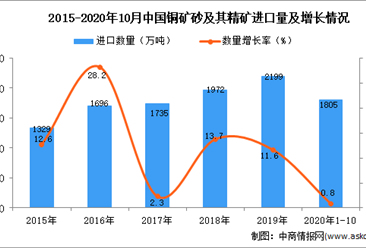 中商情报网讯:据中商产业研究院数据库显示,2020年1-10月中国铜矿砂及其精矿进口量下降,2020年1-10月中国铜矿砂及其精矿进口量为1805万吨,同比增长0.8%。 数据来源:...【详情】