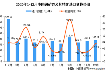 中商情报网讯:据中商产业研究院数据库显示,2020年12月中国铜矿砂及其精矿进口量增长,2020年12月中国铜矿砂及其精矿进口量为188.5万吨,同比下降2.2%。 数据来源:中...【详情】