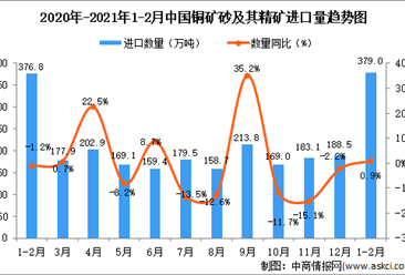 中商情报网讯:据中商产业研究院数据库显示,2021年1-2月中国铜矿砂及其精矿进口量为379万吨,同比增长0.9%。 数据来源:中商产业研究院数据库 从金额方面来看,2021年1...【详情】