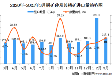 中商情报网讯:据中商产业研究院数据库显示,2021年3月中国铜矿砂及其精矿进口量217.1万吨,同比增长22%。 数据来源:中商产业研究院数据库 从金额方面来看,2021年3月中...【详情】