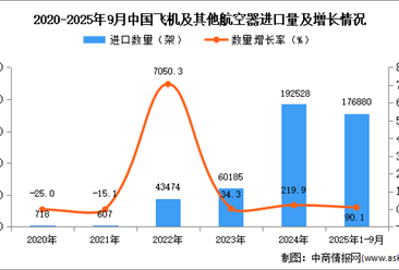 中商情报网讯:据中商产业研究院数据库显示,2024年中国飞机及其他航空器进口量192528架,同比增长219.9%。最新数据显示,2025年1-9月中国飞机及其他航空器进口量176880架...【详情】