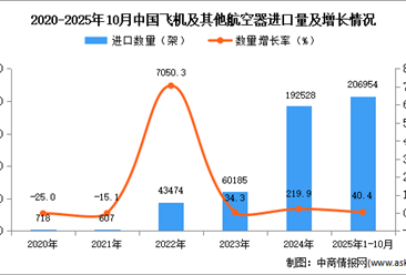 中商情报网讯:据中商产业研究院数据库显示,2024年中国飞机及其他航空器进口量192528架,同比增长219.9%。最新数据显示,2025年1-10月中国飞机及其他航空器进口量206954...【详情】