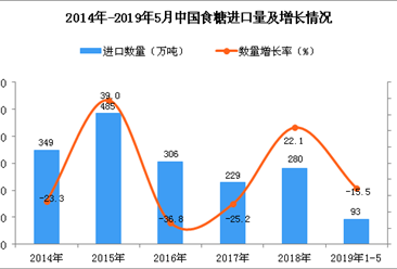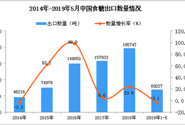 中商情报网讯:据中商产业研究院数据库显示,2015-2018年中国食糖出口量逐渐增长,2019年1-5月中国食糖出口量为69227吨,同比下降3.1%。 数据来源:中商产业研究院数据...【详情】
