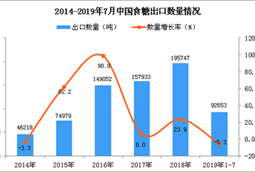 中商情报网讯:据中商产业研究院数据库显示,2019年1-2季度中国食糖出口量有小幅度增长,2019年1-7月中国食糖出口量为92653吨,同比下降5.3%。 数据来源:中商产业研究...【详情】