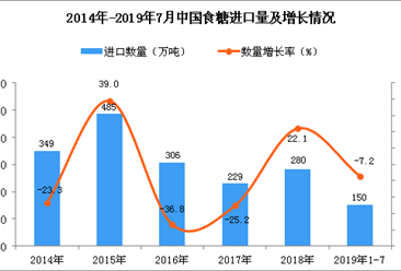中商情报网讯:据中商产业研究院数据库显示,2019年1-2季度中国食糖进口量有所增长,2019年1-7月中国食糖进口量为150万吨,同比下降7.2%。 数据来源:中商产业研究院数...【详情】