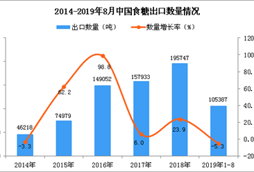 中商情报网讯:据中商产业研究院数据库显示,2019年1-2季度中国食糖出口量有小幅度增长,2019年1-8月中国食糖出口量为105387吨,同比下降5.3%。 数据来源:中商产业研究...【详情】