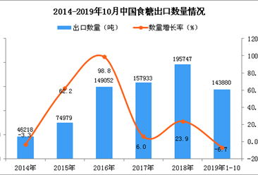 中商情报网讯:据中商产业研究院数据库显示,2014-2018年中国食糖出口量逐渐增长,增长309.76%。2019年1-10月中国食糖出口量为143880吨,同比下降6.7%。 数据来源:中商...【详情】