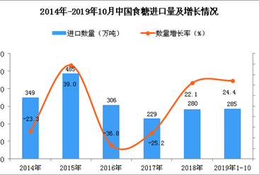 中商情报网讯:据中商产业研究院数据库显示,2015-2017年中国食糖进口量有所下降,2018年中国食糖进口量增长;2019年1-10月中国食糖进口量为285万吨,同比增长24.4%。 ...【详情】